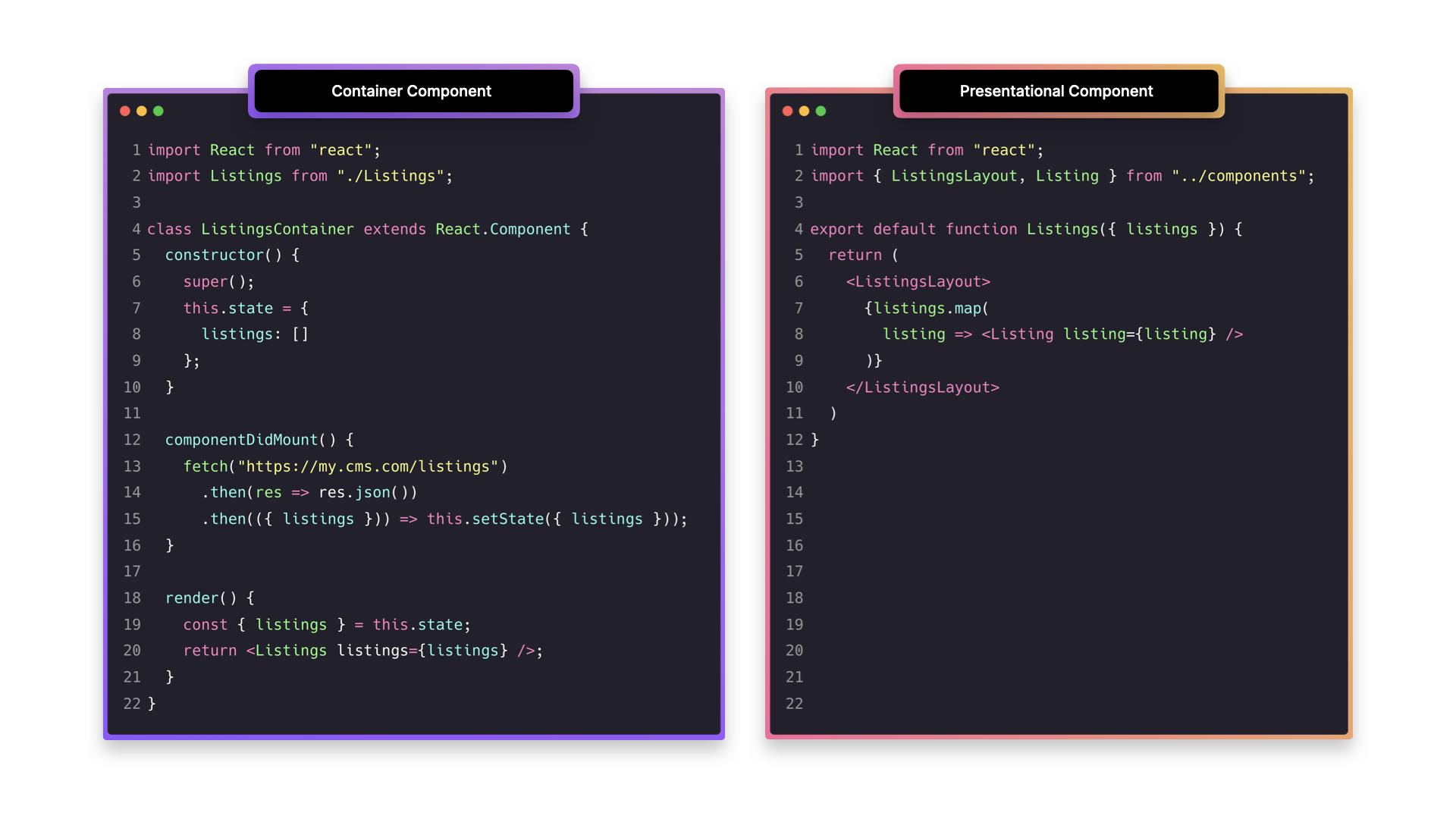 Geleneksel olarak, bir bileşenin iş mantığını (veri çekme, durum yönetimi) arayüz sunumundan (UI rendering) ayırmak için Container/Presenter (veya Smart/Dumb) deseni kullanılırdı. Hooks, bu ayrımı Custom Hooks aracılığıyla daha zarif bir şekilde yapmamızı sağlar. Artık ayrı bir